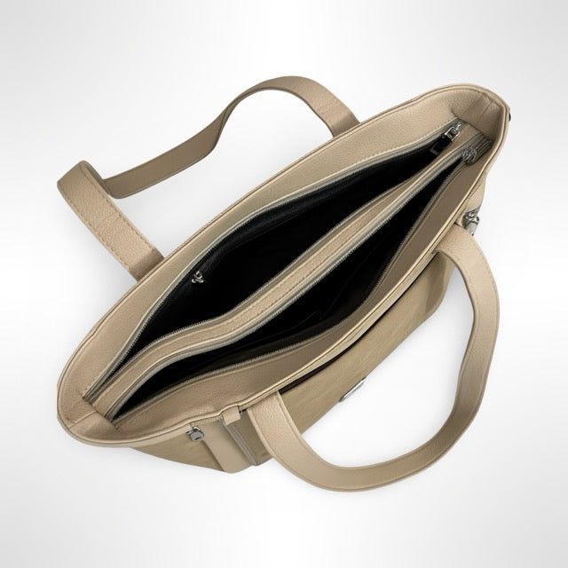 • מרווח ומאורגן: תיק גדול עם שני תאים מרכזיים רחבים, כולל ארגונית פנימית חכמה ששומרת על הסדר. כל תא נסגר עם רוכסן נפרד לחלוקה מושלמת, ובנוסף – תא אחורי עם רוכסן לאחסון מאובטח של חפצים קטנים.